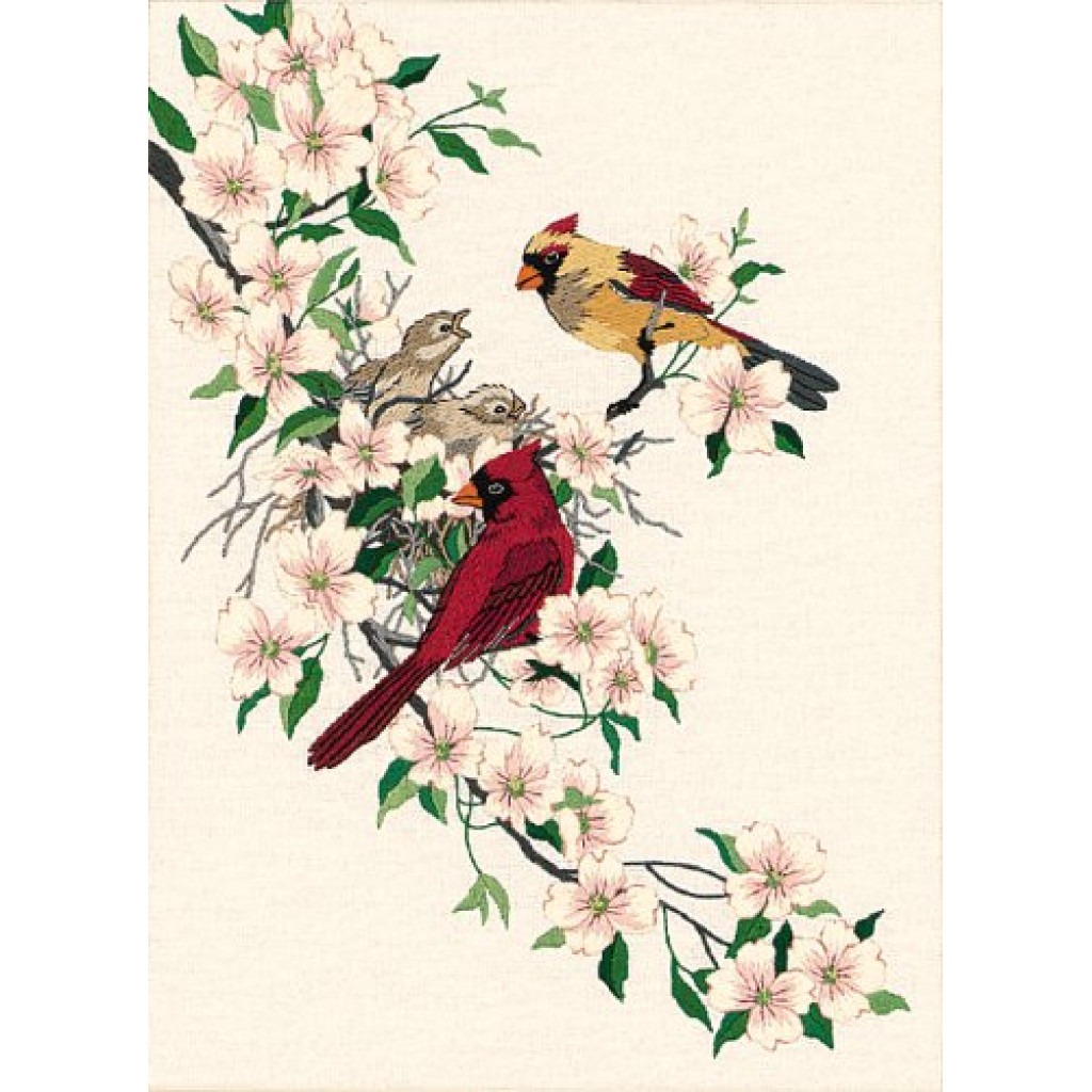 01516 Кардинали у Догвуді. 27х38 см. Dimensions. Cardinals in Dogwood. Набір для вишивання нитками (гладдю)
