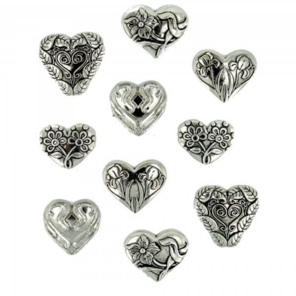 Декоративное украшение Dress It Up. Сердца серебряные. 10 шт в упаковке. Таким украшением можно украсить вязаное изделие без вреда для целостности полотна, а также любую одежду. Украшения Dress It Up станут незаменимыми для тех, кто занимается разными видами рукоделия, например, скрапбукинг.