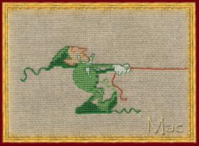 В набор входит: инструкция, символьная черно-белая схема с цветными линиями бэкстича, канва Aida 14 (лен), хлопковое мулине DMC — 7 цветов и игла.