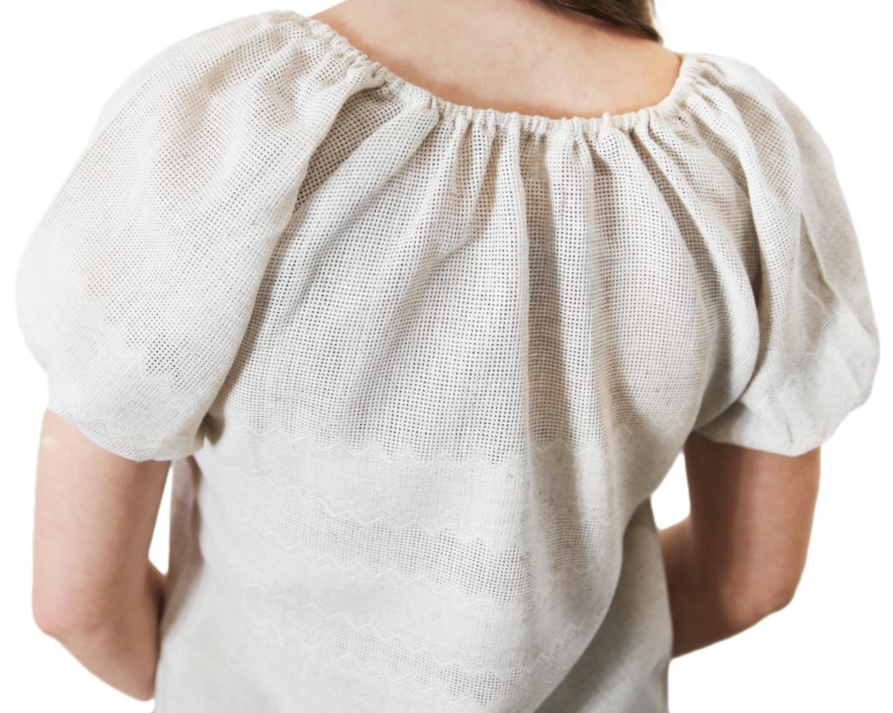 Готовая женская льняная сорочка со вставками под вышивку бисером. Вставки расположены так, как показано на рисунке. Сорочка цвета льна с коротким рукавом.