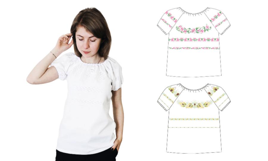 Готовая женская сорочка со вставками под вышивку бисером. Вставки расположены так, как показано на рисунке. Сорочка белого цвета с коротким рукавом.