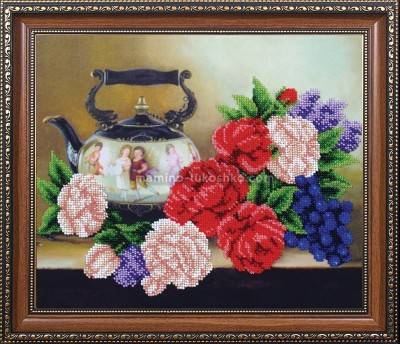 В набор входит: ткань с нанесенным рисунком, бисер (Чехия), игла, инструкция