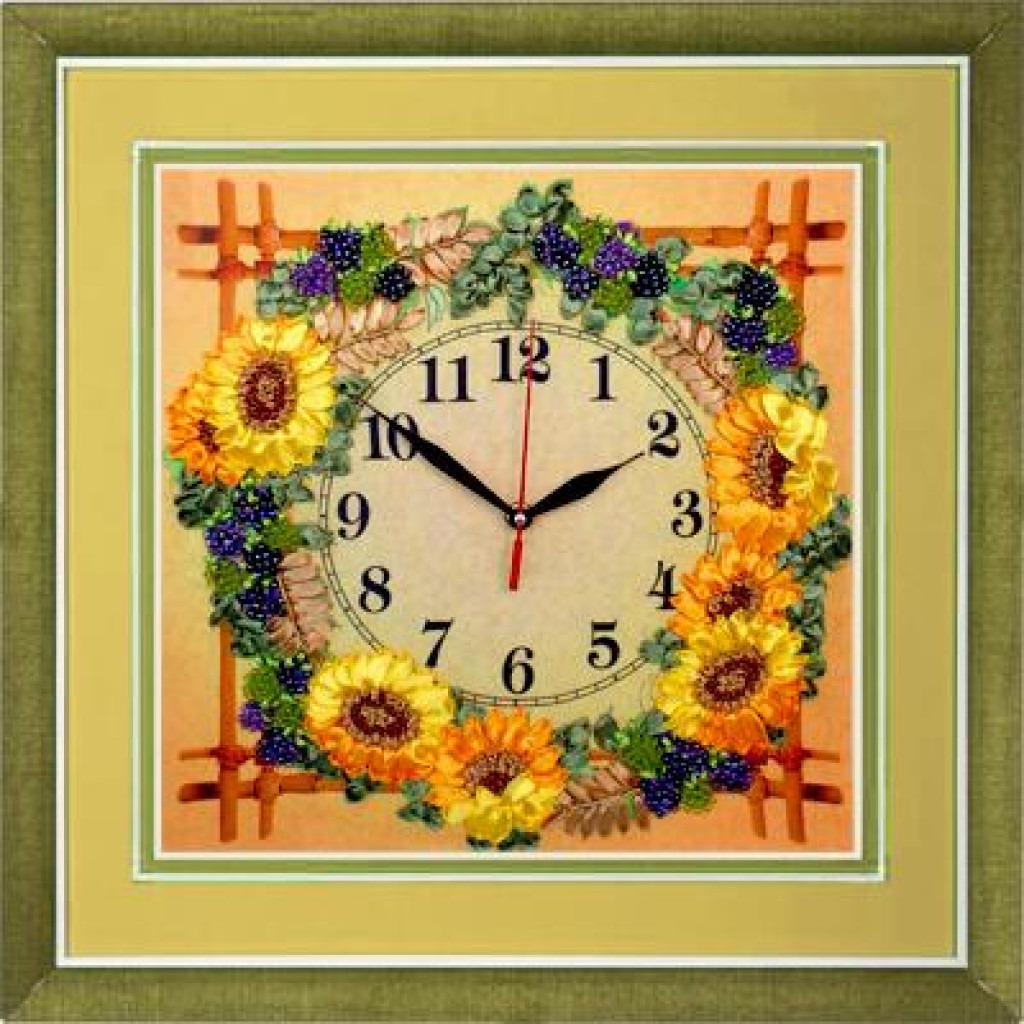 Набір для вишивання атласними стрічками. Малюнок і схема нанесені на тканину (габардин). В набір входить все необхідне для створення вашого особистого шедевра: тканина-габардин з надрукованою схемою, атласні стрічки 6 кольорів, голка для вишивання стрічками, намистини, голка для бісеру, докладна інструкція до кожного шва. Годинниковий механізм і стрілки входять в набір!