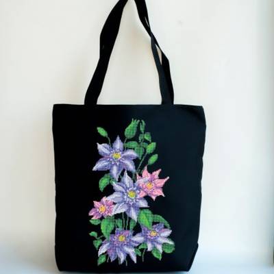 Текстильная чёрная сумка под вышивку бисером или нитками мулине «Клематисы» Арт Хата. Сумка полностью сшита, застёгивается на застёжку-молнию, имеет наружный карман на молнии и внутренние кармашки для мелких предметов. Подкладка не застрочена снизу, есть свободный доступ к изнанке для удобства вышивания. После окончания вышивания отверстие в подкладке необходимо зашить вручную или на швейной машинке. Две ручки изготовлены из ременной ленты и вшиты в сумку таким образом, чтобы во время использования не расходились швы и не деформировалась вышивка. Сумка сшита из текстильного полотна с добавлением синтетических волокон. Это обеспечивает прочность, износоустойчивость и долговечность изделия. Рисунок со схемой вышивки нанесен на ткань при помощи качественной печати. Краски не линяют, и не теряют своей насыщенности со временем. Основная ткань на долгое время сохранит свой глубокий чёрный цвет. Техника вышивки – на выбор рукодельницы. Схема рассчитана на вышивку бисером или нитками мулине. Можно скомбинировать обе техники и получить уникальную вышитую сумочку. Такой аксессуар может стать оригинальным подарком. К сумке прилагается перечень цветов и количество необходимого бисера, номера бисера не указаны. По ключу можно самостоятельно подобрать необходимые цвета бисера или ниток. Так же в нашем магазине есть возможность укомплектовать сумку чешским бисером с небольшим запасом. Для этого при оформлении заказа в поле «комментарий» нужно написать «подбор бисера под схему». Дополнительно схему можно укомплектовать бисерными иглами и нитями. Размер сумки 35х40 см. На передней стороне чёрной сумки вышиваются нежные сиреневые и розовые клематисы. Плетущийся клематис на картине означает развитие, победу над самим собой, творческий и карьерный рост.