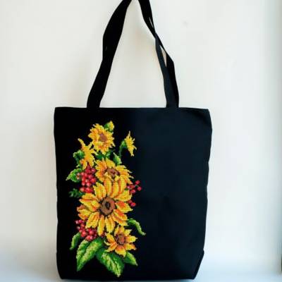 Текстильная чёрная сумка под вышивку бисером или нитками мулине «Подсолнухи» Арт Хата. Сумка полностью сшита, застёгивается на застёжку-молнию, имеет наружный карман на молнии и внутренние кармашки для мелких предметов. Подкладка не застрочена снизу, есть свободный доступ к изнанке для удобства вышивания. После окончания вышивания отверстие в подкладке необходимо зашить вручную или на швейной машинке. Две ручки изготовлены из ременной ленты и вшиты в сумку таким образом, чтобы во время использования не расходились швы и не деформировалась вышивка. Сумка сшита из текстильного полотна с добавлением синтетических волокон. Это обеспечивает прочность, износоустойчивость и долговечность изделия. Рисунок со схемой вышивки нанесен на ткань при помощи качественной печати. Краски не линяют, и не теряют своей насыщенности со временем. Основная ткань на долгое время сохранит свой глубокий чёрный цвет. Техника вышивки – на выбор рукодельницы. Схема рассчитана на вышивку бисером или нитками мулине. Можно скомбинировать обе техники и получить уникальную вышитую сумочку. Такой аксессуар может стать оригинальным подарком. К сумке прилагается перечень цветов и количество необходимого бисера, номера бисера не указаны. По ключу можно самостоятельно подобрать необходимые цвета бисера или ниток. Так же в нашем магазине есть возможность укомплектовать сумку чешским бисером с небольшим запасом. Для этого при оформлении заказа в поле «комментарий» нужно написать «подбор бисера под схему». Дополнительно схему можно укомплектовать бисерными иглами и нитями. Размер сумки 35х40 см. На передней стороне чёрной сумки вышивается букет подсолнухов. Подсолнухи в вышивке символизируют солнечную энергию, здоровье и стремление к поставленной цели. Вышейте оригинальный аксессуар и талисман.