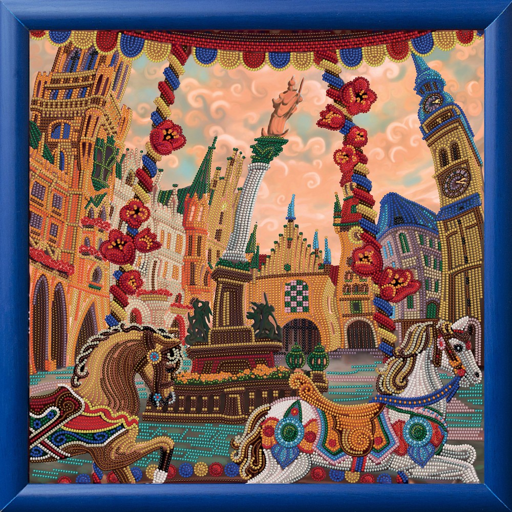 Набор содержит все необходимые материалы для выполнения вышивки — ткань с нанесенной схемой для вышивки, бисер, иглу, нитевдеватель, нить для пришивания бисера, инструкцию.