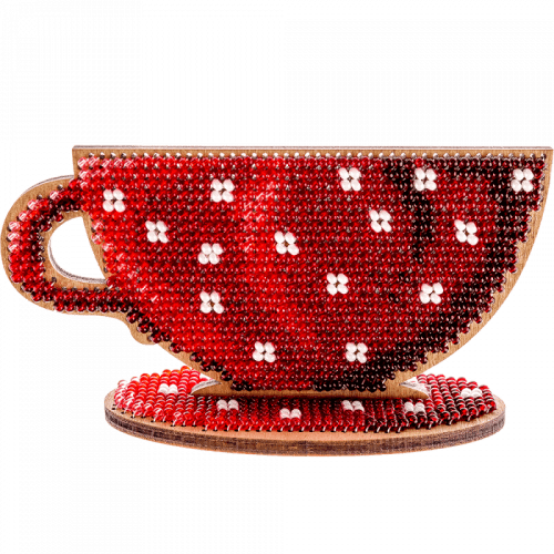 Усередині упаковки FLK-123 Чашка в горошок ви знайдете фігурну перфоровану заготівлю, виконану з високоякісної фанери, інструкцію по роботі з набором, надруковану на папері схему для вишивання із зазначенням квітів і кількості бісеру, використовуваного в наборі, чеський бісер PRECIOSA, нитка і голки для вишивання бісером. Також набір може бути укомплектований фетром (для декорування задній частині виробу) або магнітом.