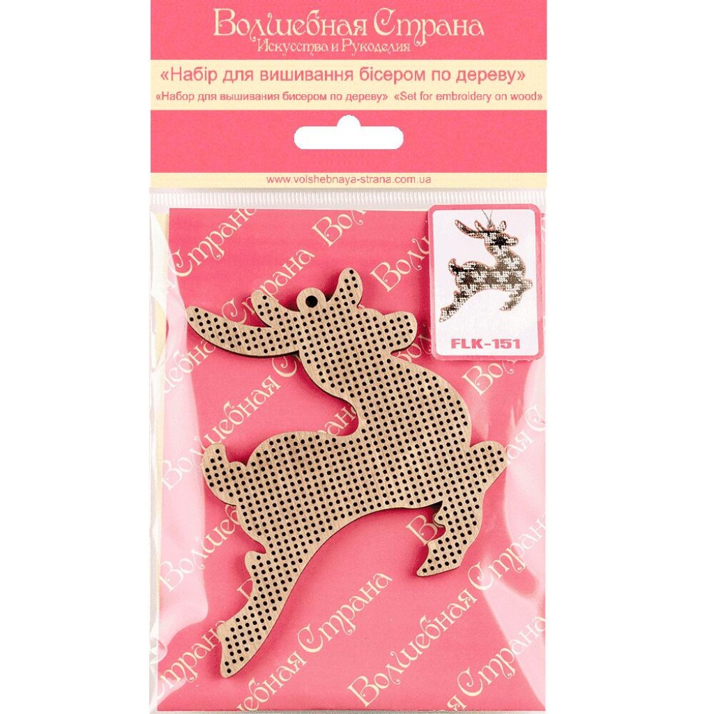 Усередині упаковки FLK-151 Олень ви знайдете фігурну перфоровану заготовку, виконану з високоякісної фанери, інструкцію по роботі з набором, надруковану на папері схему для вишивання із зазначенням квітів і кількості бісеру, використовуваного в наборі, чеський бісер PRECIOSA, нитка і голки для вишивання бісером. Також набір може бути укомплектований фетром (для декорування задньої частини виробу) або магнітом.