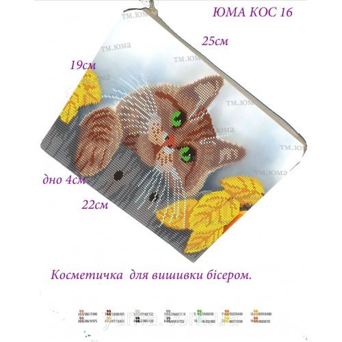 Косметичка з нанесеною схемою для вишивки бісером, зшита з міцної наметової тканини, водонепроникна, стійка до ультрафіолетового випромінювання, відносно легка і м’яка, стійка до механічних пошкоджень (стирання, відшаровування, розриву). Всередині є підкладка. Розмір 25 на 18 см, дно 4 см. Форма трапеція, застібка блискавка.