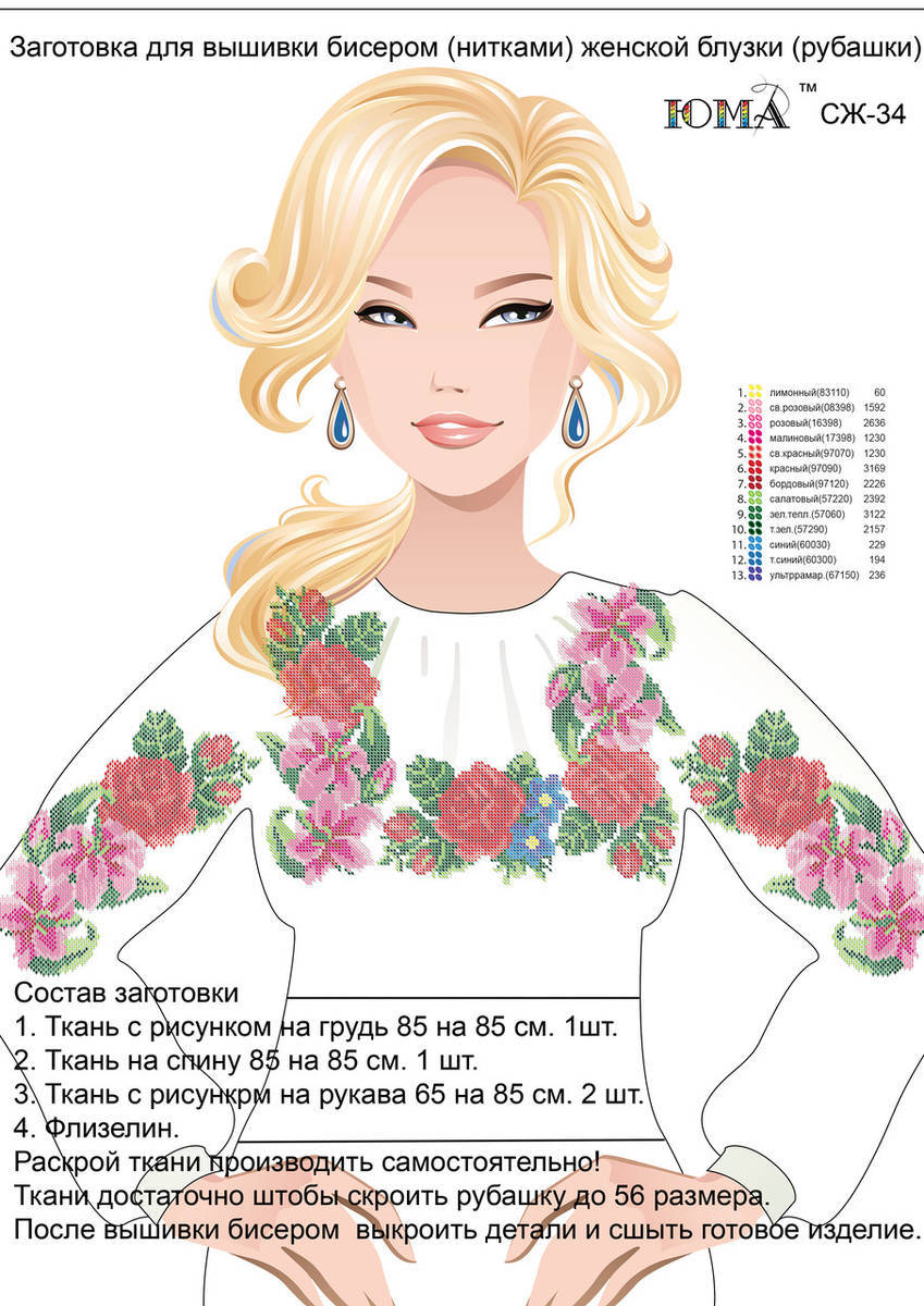 ЮМА-СЖ34 Женская рубашка. Схема-заготовка для частичной вышивки бисером или нитками женской рубашки. ТМ ЮМА