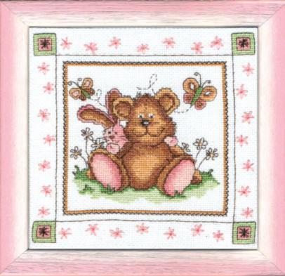 В набор входит: инструкция, цветная символьная схема, канва хлопок 55 клеток в 10 см, мулине Anchor и игла.