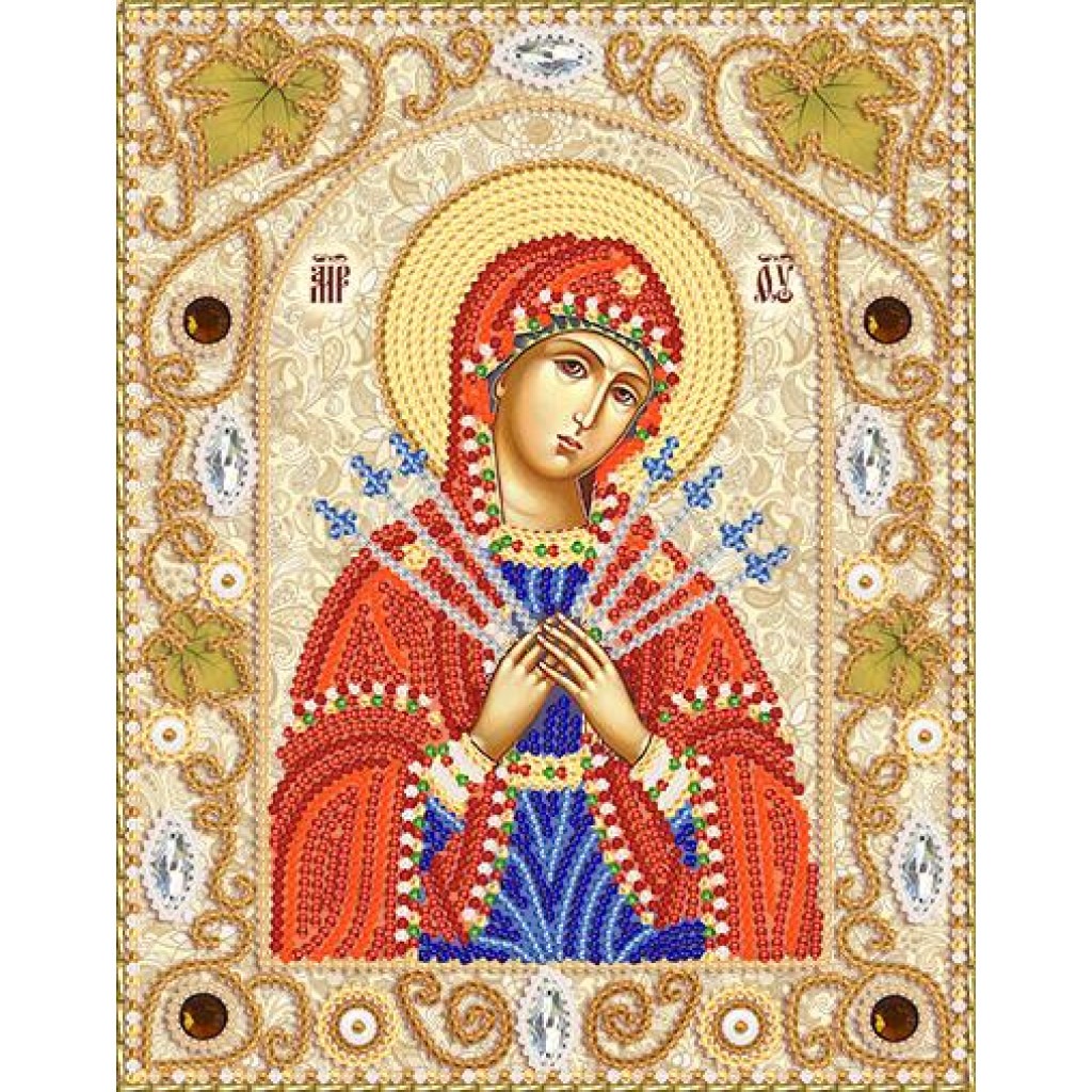 У набір входить все необхідне для створення картини: атласна тканина з нанесеним малюнком і ексклюзивною схемою, потрібну кількість високоякісного бісеру Preciosa Ornela (Чехія), пришивні камені, перлинні намистини і золотий стеклярус, спеціальна голка для бісеру, докладна інструкція.