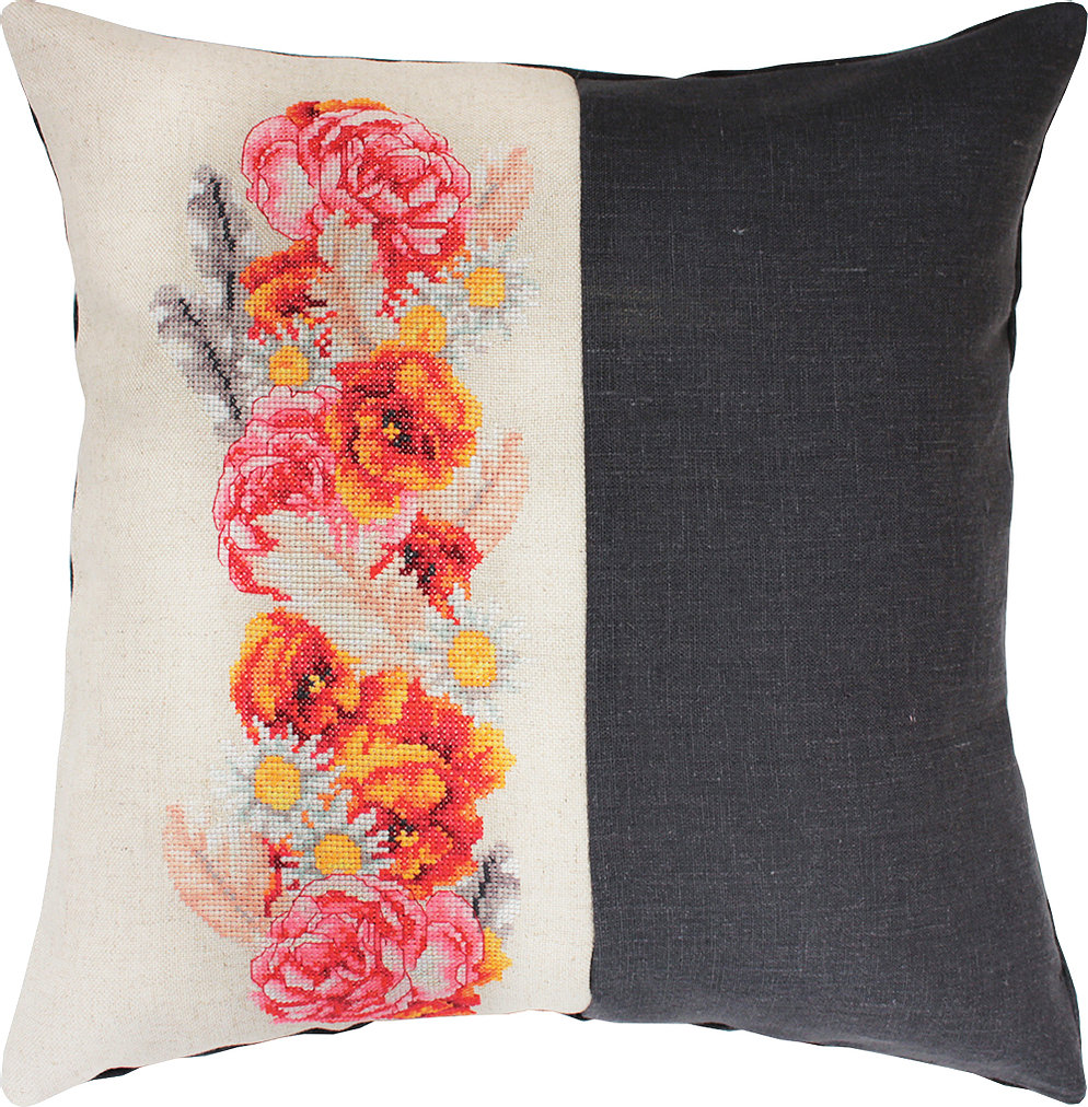 В состав набора входит: цветная фотография готовой подушки, мулине Anchor хлопок, схема, ткань для вышивания производства немецкой фирмы Zweigart, ткань для оборота, игла, молния, инструкция.