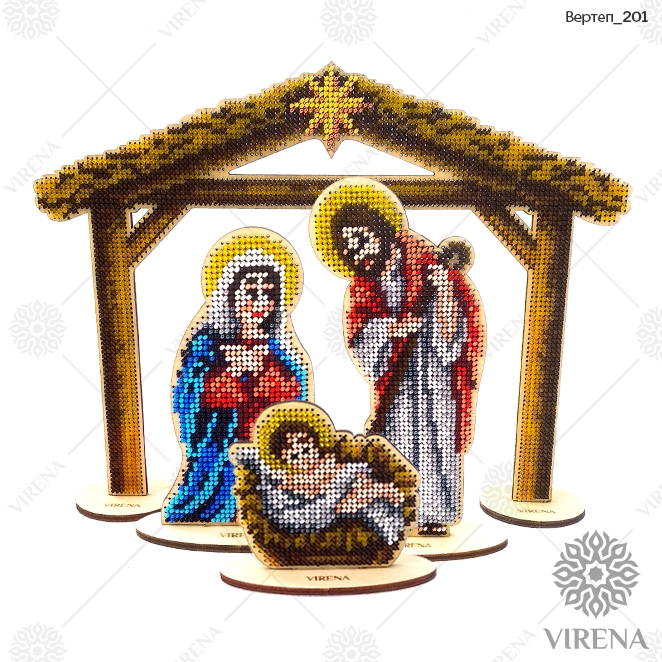 Набір перфорованих заготовок для вишивки бісером, які зображають сцену Різдва Христового.