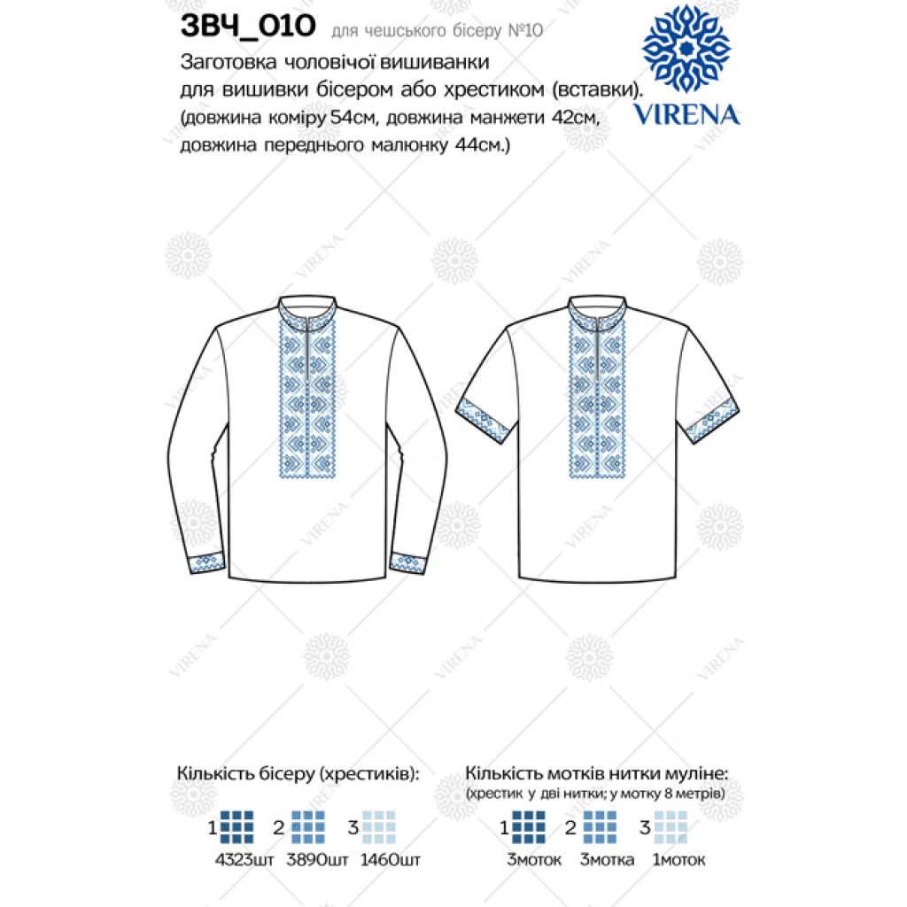 Довжина коміру 54 см, довжина манжет 42 см, довжина переднього малюнку 44 см.